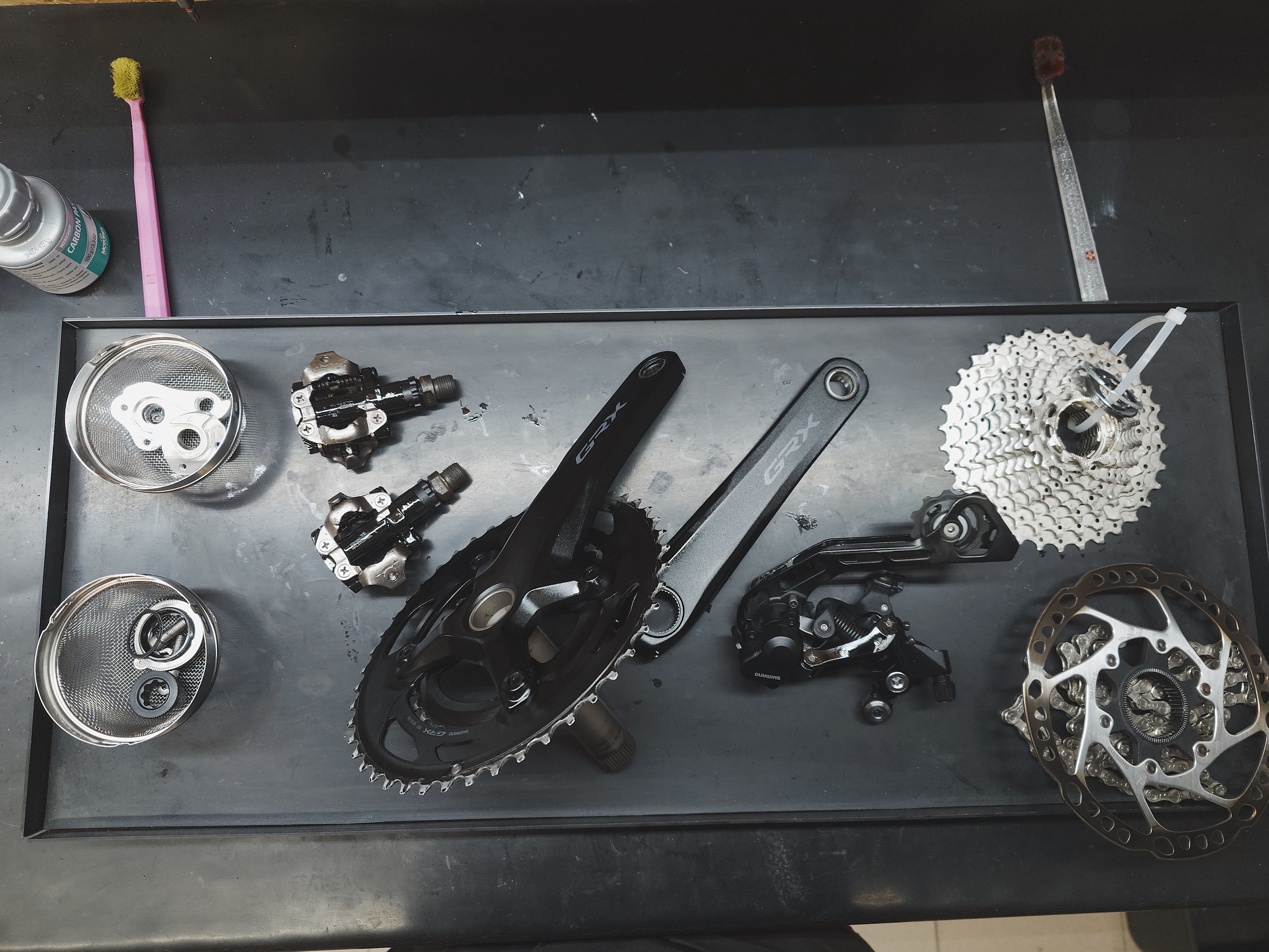 • moc dlouhý řetěz • obráceně daná spojka • velký převodník bude za chvíli na výměnu • nad rámec balíčku demontovány patky ( byly na sucho) • na brzdových třmenech jde znát ježdění v zimě (odlupuje se barva) • dány nové gumové krytky na odvzdušňovací šrouby jako 🎁 • duše jsou obě v pořádku i velikostně • celkově kolo hodně zaneřáděno • přesmykač je hodně vysoko ale funguje / posunout dolů s novým lankem