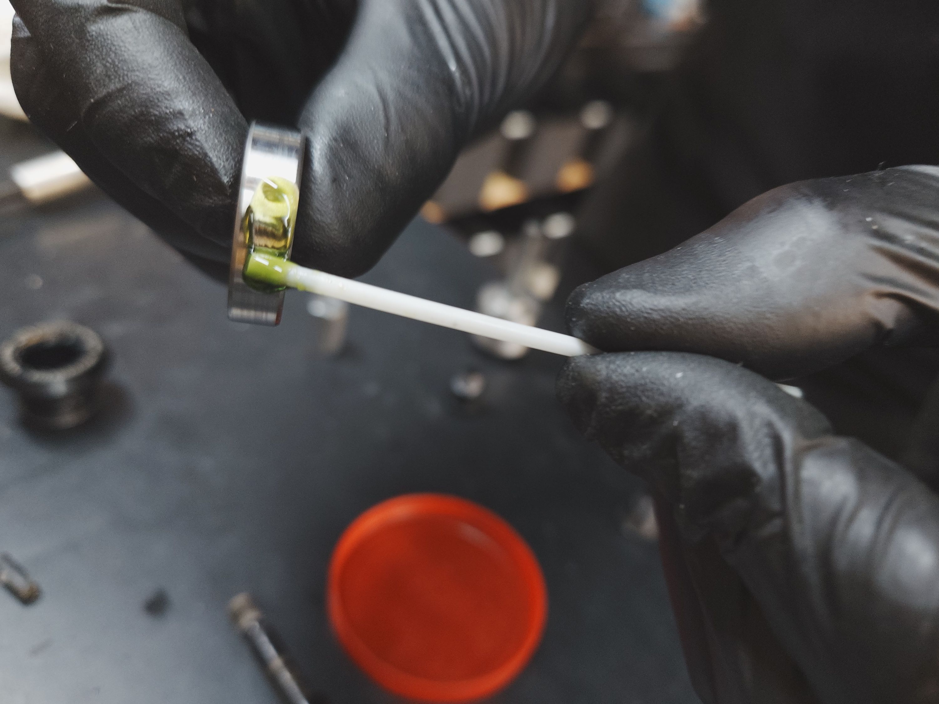 Málo maziva v ložiskách / původní ložiska jsou klecová / v některých je rez / ložiska vyměněna za bezklecová (vyšší únosnost a odolnost) / zbylé domazány mazivem almagard 3752 / na fotce zakroužkovány červeně nová ložiska, šedě domazaná ložiska / šrouby zadní stavby zalepeny loctitem 243 a dotaženy na moment