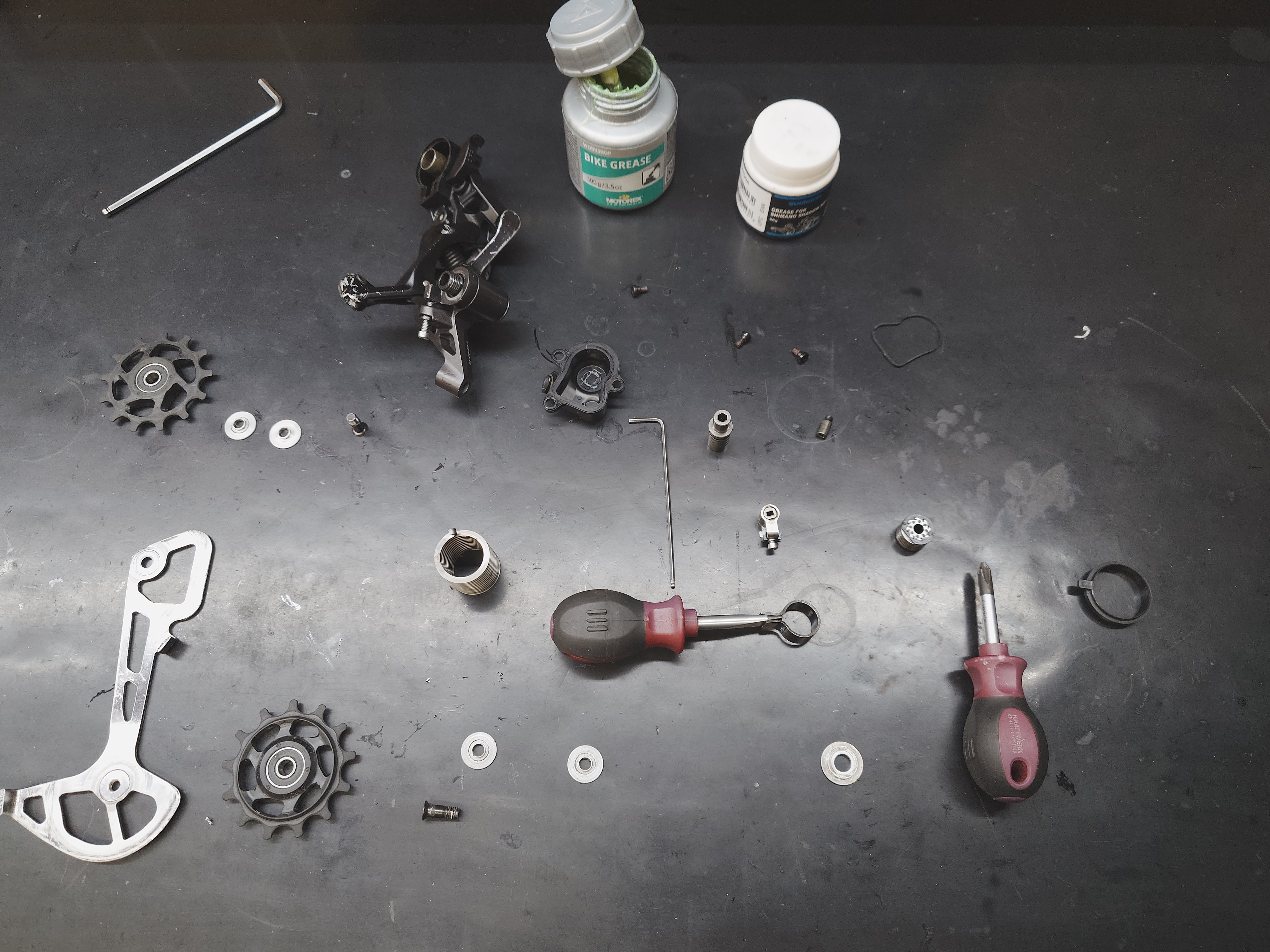 umyta a odmaštěna ručněpovrch ošetřen suchým teflonemčepy promazány XCP LPkompletní repasešroubky kladek zalepeny na loctite 243brzda promazána mazivem Shimano Shadow RD+pružina vyčištěna a namazána Motorex 2000seřízenaStav OK
