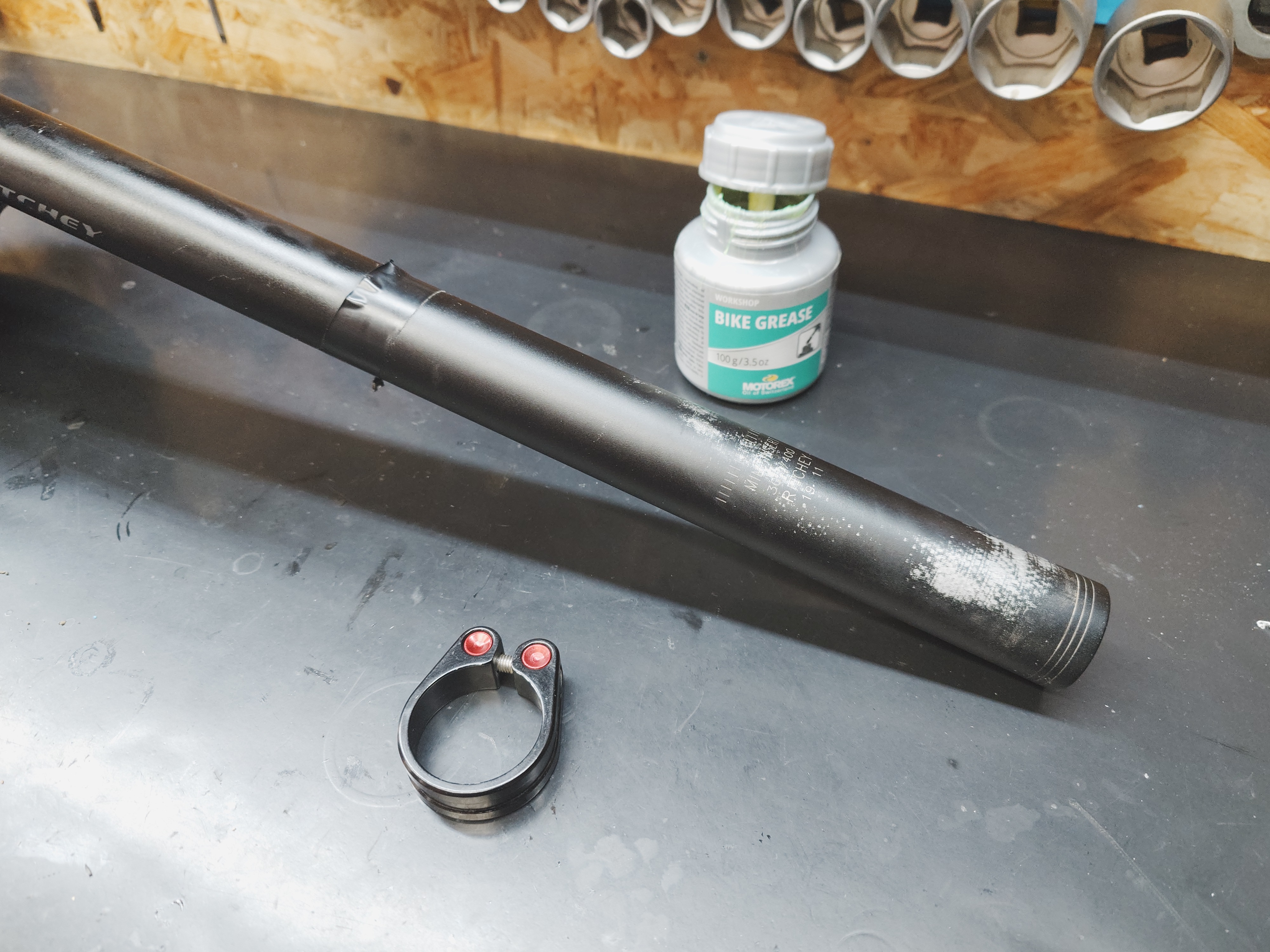 vytažena z rámu (míra zasunutí zaznamenána)vyčištenavyčištěna objímkaobjímka podmazána Motorex 2000podmazána Motorex Carbon Pastedotažena na moment 4NmStav OK